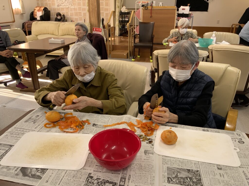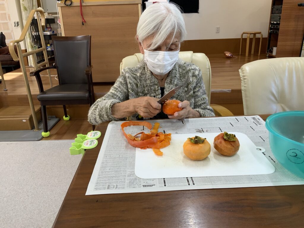 中では、おやつ用の柿剥き