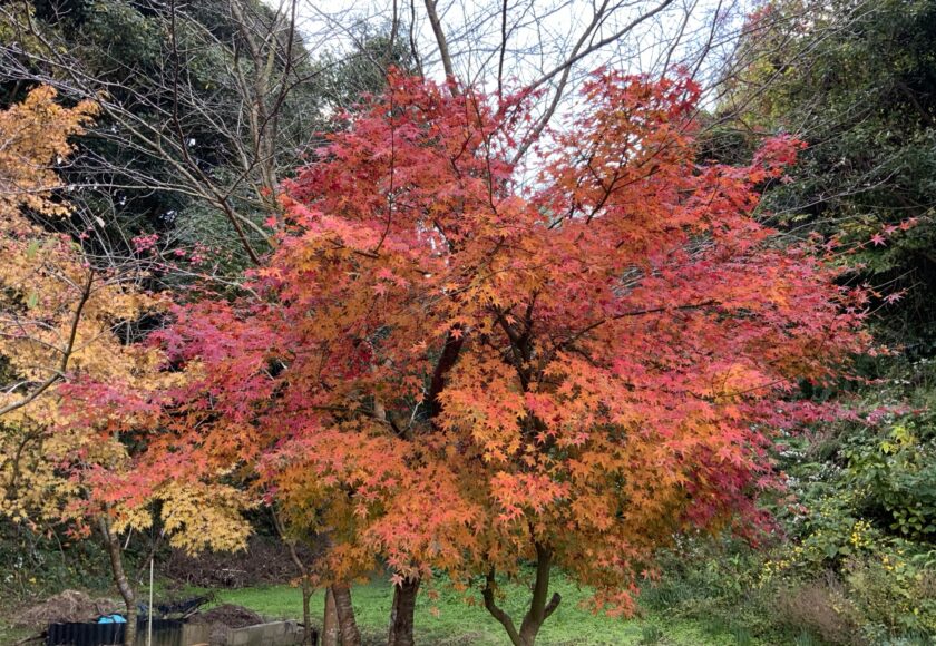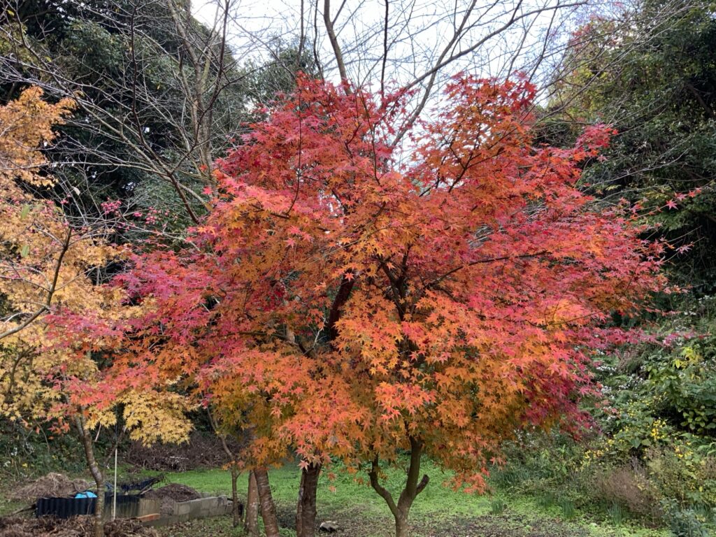 さくら館の前の紅葉もこの寒さでほらこのとおり