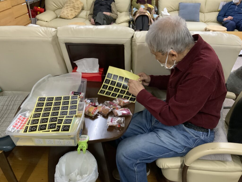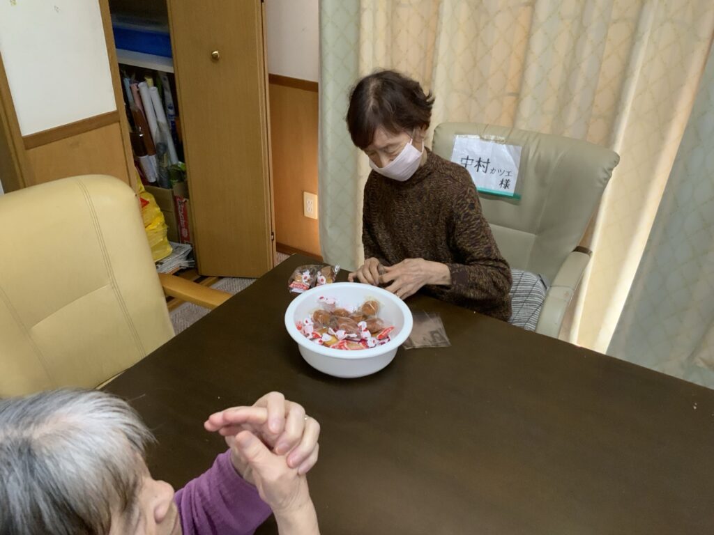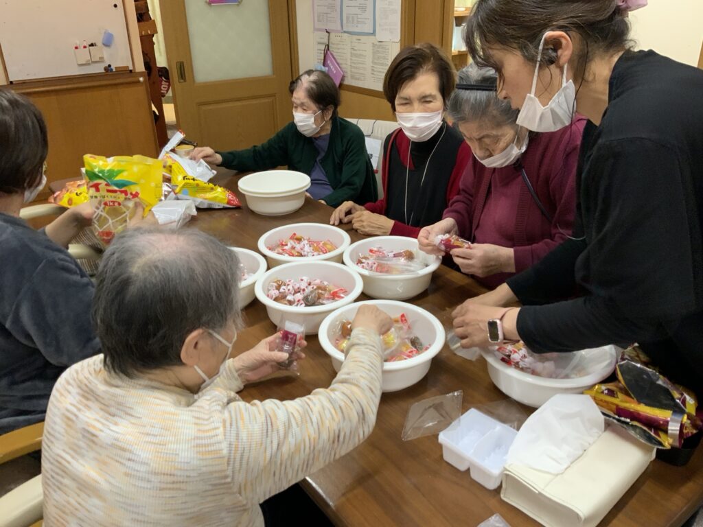 手指作業としてお菓子の袋詰め